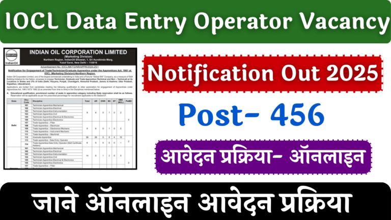 IOCL Data Entry Operator Vacancy 2025: दोस्तों इंडियन ऑइल कारपोरेशन लिमिटेड में 456 पदों पर भर्ती का नोटिफिकेशन जारी कर...