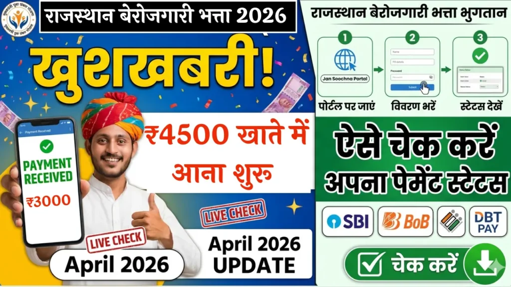 Berojgari Bhatta Payment Status: राजस्थान बेरोजगारी भत्ता भुगतान स्थिति 2026 के संबंध में युवाओ के लिए महत्वपूर्ण खबर है। राजस्थान … Continue reading Berojgari Bhatta Payment Status: खुशखबरी! राजस्थान बेरोजगारी भत्ता के ₹4500 खाते में आना शुरू; ऐसे चेक करें अपना पेमेंट स्टेटस