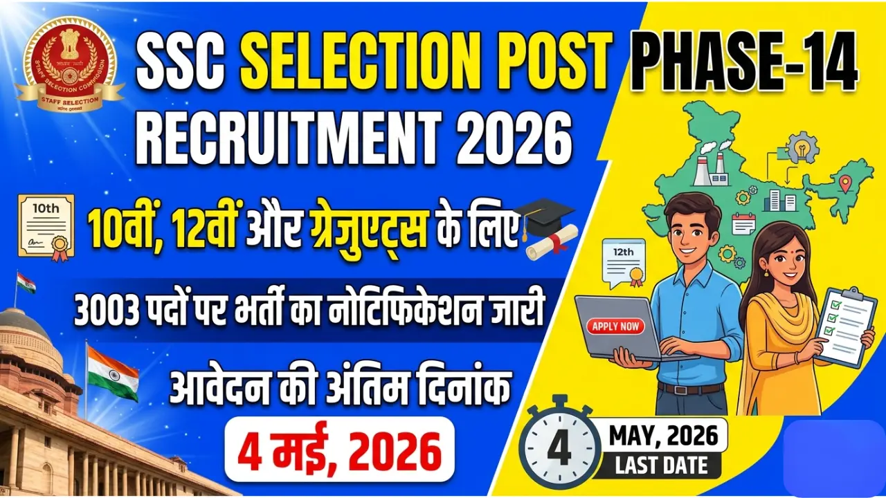 SSC Selection Post Phase-14 Recruitment 2026: एसएससी ने सिलेक्शन पोस्ट फेज-14 के तहत विभिन्न विभागों में 3003 रिक्त पदों को भरने के लिए आधिकारिक नोटिफिकेशन जारी कर दिया है। इस भर्ती की सबसे खास बात यह है कि इसमें 10वीं पास, 12वीं पास और स्नातक (Graduate) उम्मीदवारों के लिए अलग-अलग पद मौजूद हैं।एसएससी द्वारा अभ्यर्थियों से ऑनलाइन आवेदन आमंत्रित किए गए है।अगर आप भी इस भर्ती लिए इच्छुक है और इसकी पात्रता को पूरा करते है, तो दिनांक 4 मई 2026 से पहले आवेदन कर सकत है। अभ्यर्थियों को आधिकारिक वेबसाइट के माध्यम से आवेदन करना होगा। आइए आज इस लेख में इस भर्ती की योग्यता, आयु सीमा, आवेदन शुल्क, शैक्षणिक योग्यता और आवेदन प्रक्रिया के बारे में विस्तार से बात करते है।